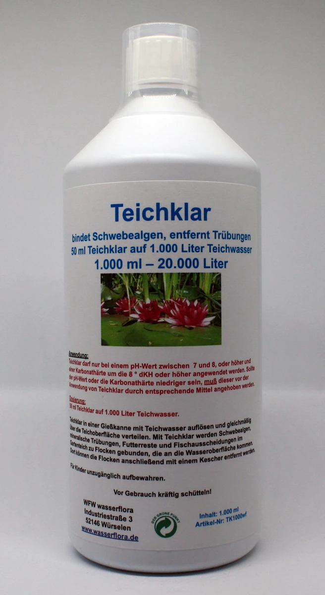 1 Liter Teichklar – gegen grünes Teichwasser (Schwebealgen) im Gartenteich, für 20.000 Liter Teichwasser