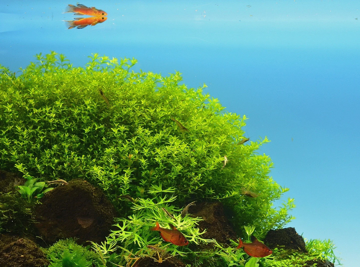 Die Heimat von Hemianthus glomeratus, ehem. Micranthemum glomeratus ist die OstkĂĽste von Nordamerika – Florida. Die Blätter der Unterwasserpflanzen (submers) sind lanzettlich bis elliptisch – sie sind ca. 3-8 mm lang und ca. 2-4 mm breit. Ăśberwasserpflanzen (emers) sind deutlich kleiner als submerse, wachsen kriechend und haben elliptische Blätter. Emers wächst die Hemianthus-Art auf steinigem oder schlammigem Bodengrund an Flussläufen in dichten, flachen, hellgrĂĽnen Teppich aus winzigen kriechenden Trieben. Und nur In der Landform entwickeln sich die sehr kleinen weiĂźlichen BlĂĽten. Ihr lockerer, aufrechter Wuchs und die leuchtend hellgrĂĽne Farbe vermitteln einen frischen, frĂĽhlingshaften Eindruck. Die Pflanze wird auch unter dem Namen Amerikanisches Perlkraut im Handel angeboten. Mit Hilfe einer scharfen Schere lässt sich die Pflanze gut einkĂĽrzen. Nach dem RĂĽckschnitt treiben viele neue Seitentriebe aus und der Bestand wirkt kompakter und dichter. Sehr kontrastreich ist die Kombination der hellgrĂĽnen Hemianthus mit rotlaubigen Arten wie der Alternanthera.