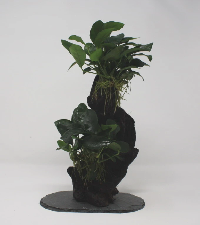 Der robuste, urwüchsige Stamm der MBUNAs besteht aus einer afrikanischen Mopani-Wurzel. Zwergspeerblätter Anubias nana bilden die Blattkrone. Der Fuß des Urwaldbäumchens besteht aus einer standsicheren Schieferplatte, die auch im Bodengrund nicht verrottet.