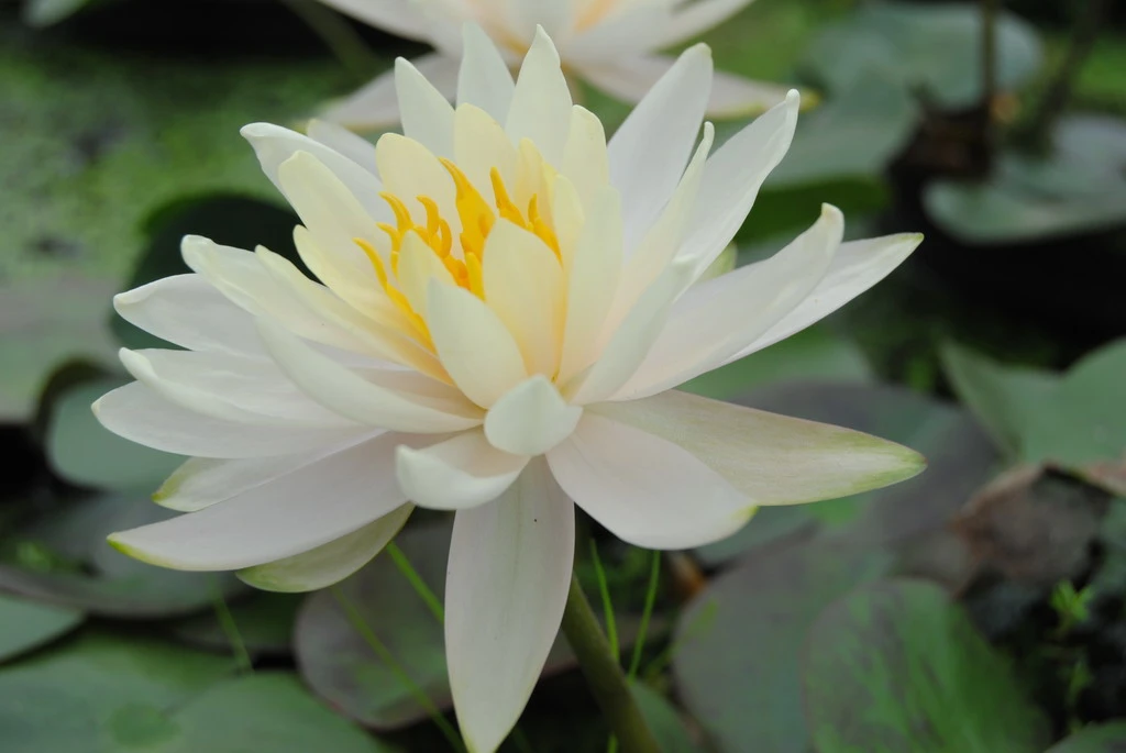 Nymphaea ‚Albatros‘ ist eine blühwillige Seerose mit schlanken, milchweißen Blüten.